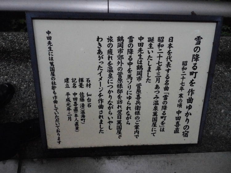 【山形県鶴岡市湯温海丁1 あつみ温泉 萬国屋 中庭にある 雪の降る町を ゆかりの宿碑】